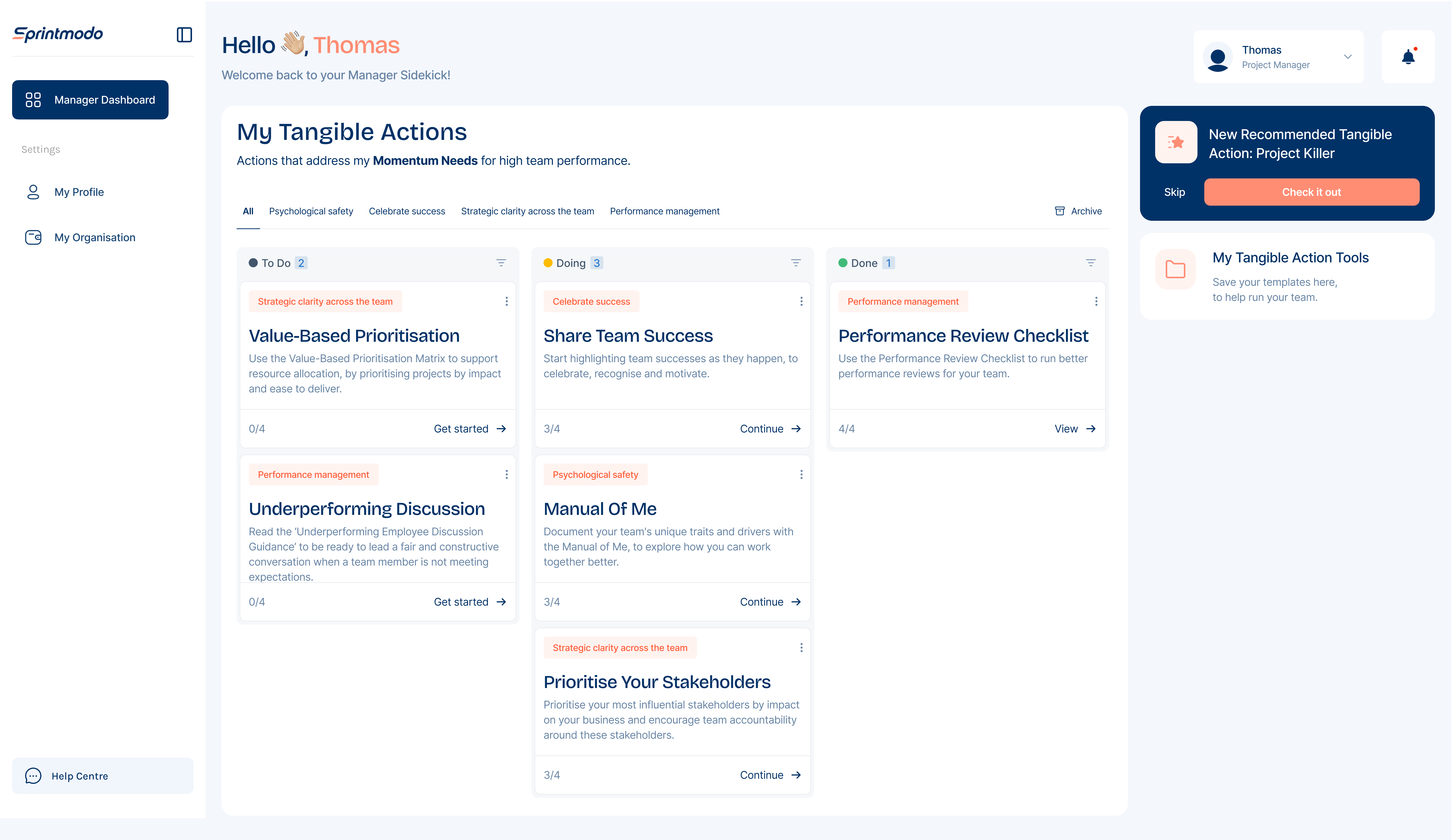 The Manager Sidekick helps managers understand and deliver on their value drivers, what their team needs from them, and how to influence their other stakeholders.